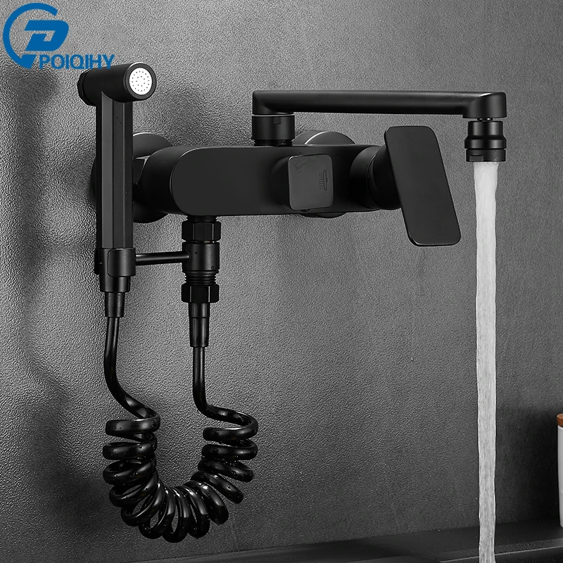 thanks to poiqihy Official Store for Kitchen Faucet Shower-Sink Wall-Tap Brass Matte Black Rotating Cold Hot POIQIHY